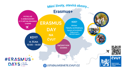 Pak se přijďte ptát na Erasmus Day, který se bude konat v úterý 14. října 2025 od 10:00 do 14:00 v atriu Fakulty architektury ČVUT.